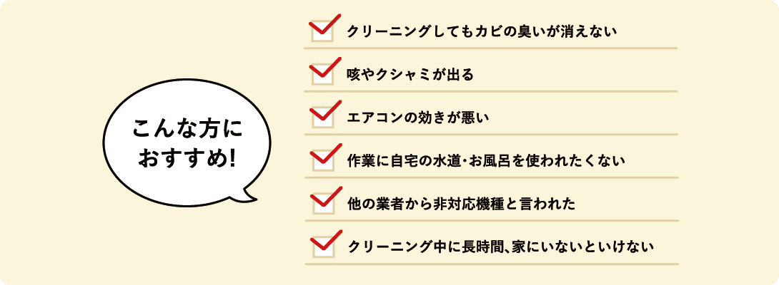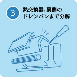 熱交換器という部品に隠れている部位は、外から高圧洗浄してもきれいにはなりません。 カビ・ほこりが付着している熱交換器まで外すことが出来れば、エアコン全体の完璧な洗浄が可能です。 完全分解(オーバーホール)方式のエアコンクリーニングは、エアコン室内機を壁から取り外さなければ実現できません。 一般的なエアコンクリーニングに比べ時間と手間が掛かりますが、お客様からは見えないところまで綺麗にできるメリットがあります。